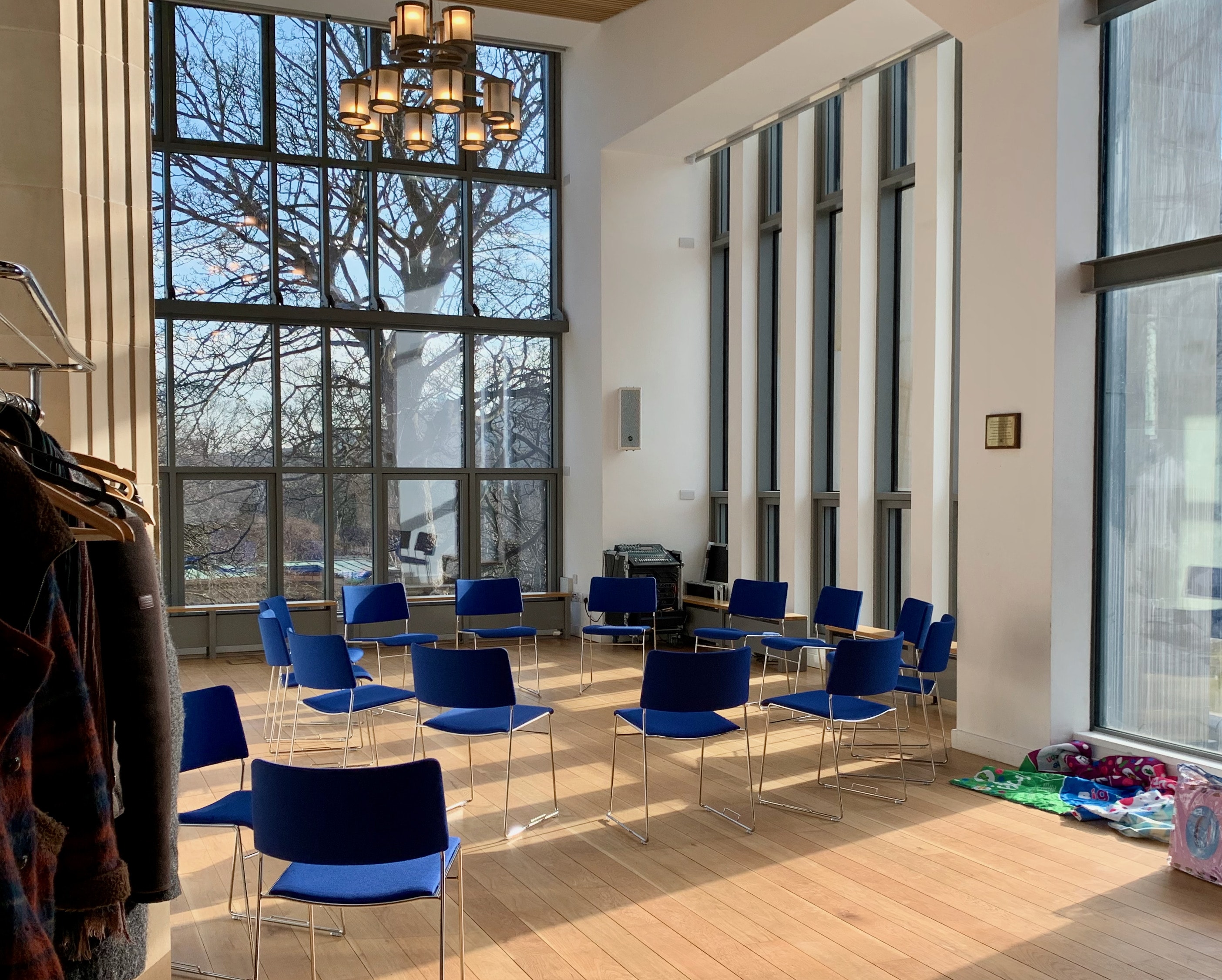 You can either go up the steps to the big door, or go around to the right of the building and use the flat entrance at the back door. This back door takes you into the sanctuary, head towards the back of the hall and you’ll see us through the double doors. These doors are locked, so do catch our eye and we’d be happy to let you in!